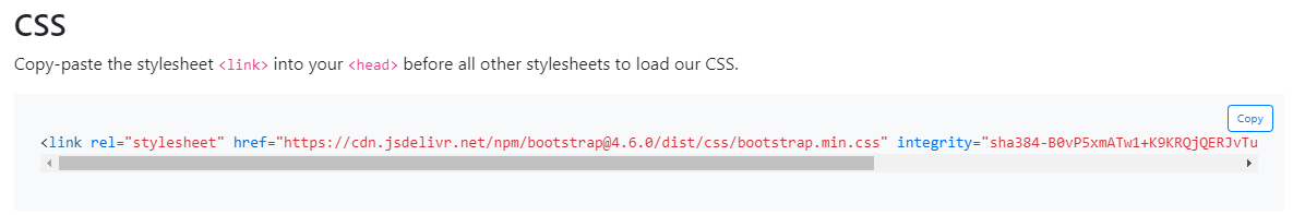 <link rel="stylesheet" href="https://cdn.jsdelivr.net/npm/bootstrap@4.6.0/dist/css/bootstrap.min.css" integrity="sha384-B0vP5xmATw1+K9KRQjQERJvTumQW0nPEzvF6L/Z6nronJ3oUOFUFpCjEUQouq2+l" crossorigin="anonymous">