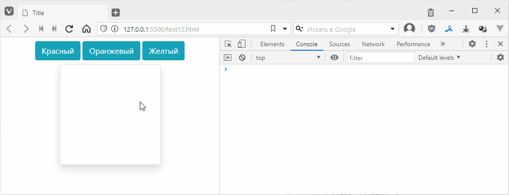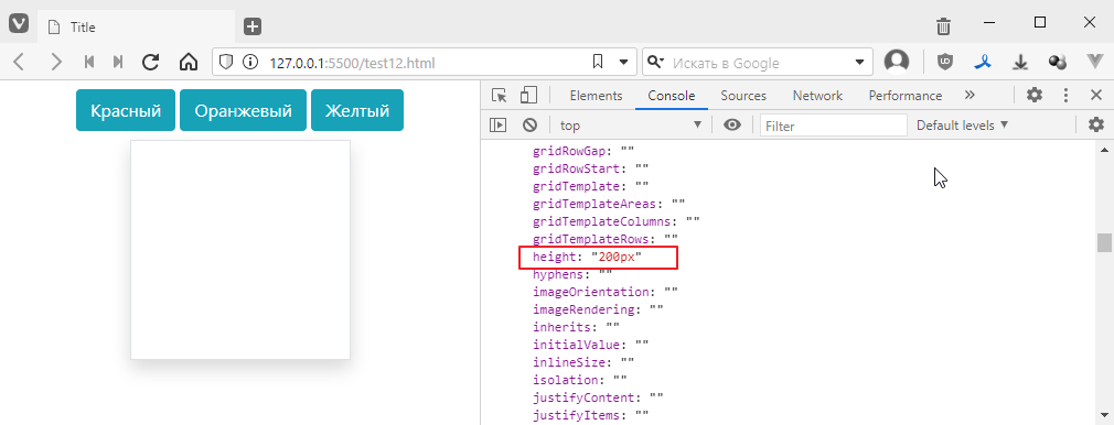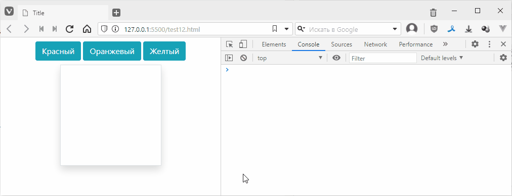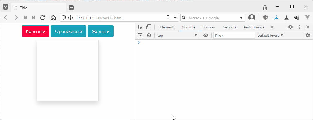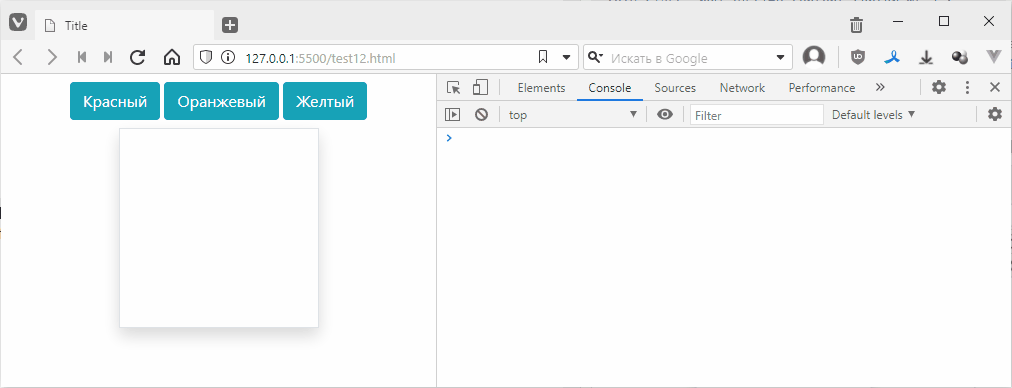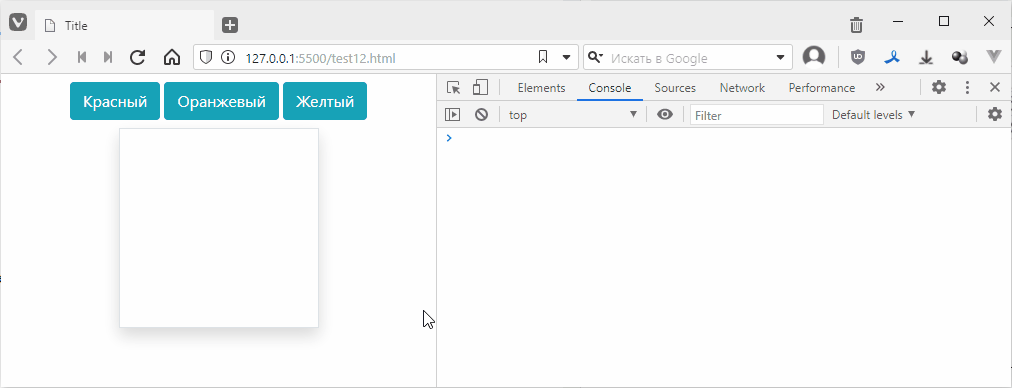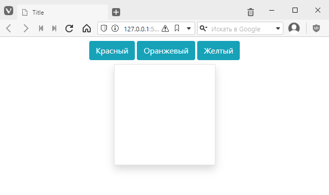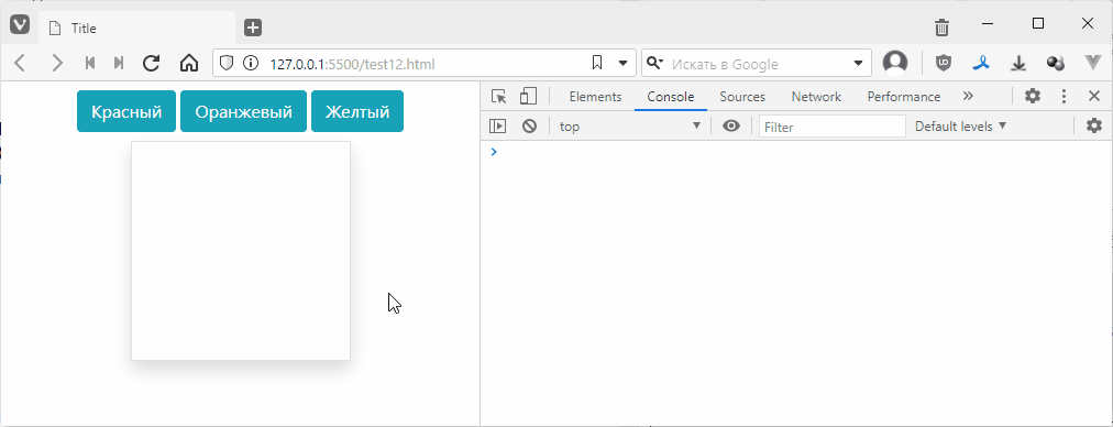 Доделать задание, чтобы каждая кнопка имел стиль с цветом, а при клике на кнопку квадрат менял цвет на соответствующий кнопке, а также на нем появлялась та же надпись что и на кнопке