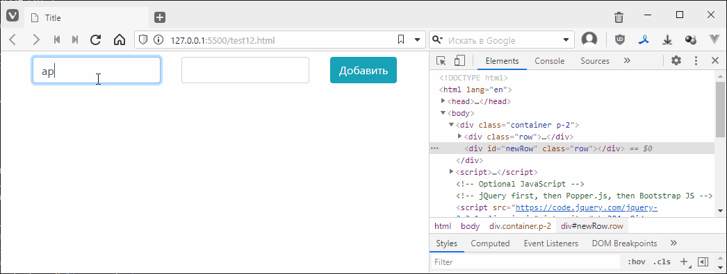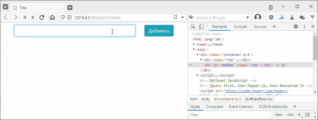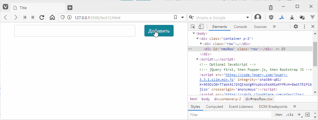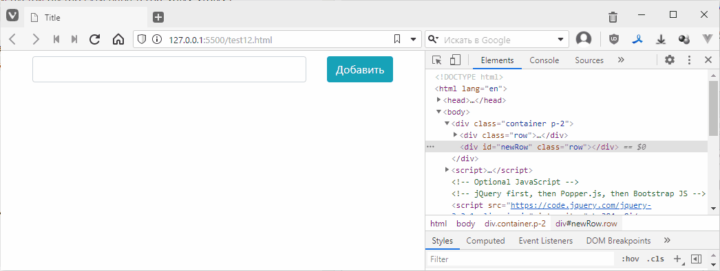 теперь попробуем создать новый элемент. Чтобы его создать его надо куда-то помещать, то есть в разметке он должен где-то оказаться. Добавим, например, новую строку и присвоим ей id: