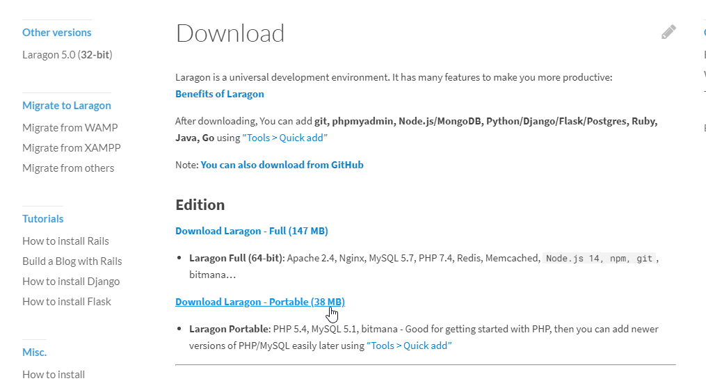 И так идем на сайт https://laragon.org/download/ и качаем портабельную версию: