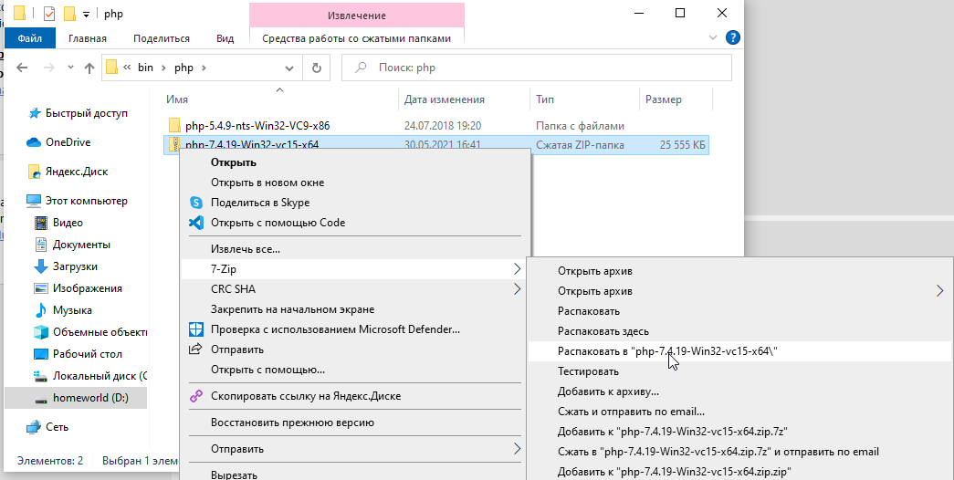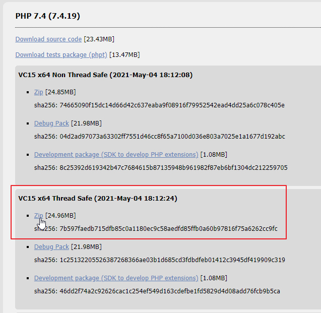 теперь скачаем PHP версии 7, ну чтобы быть более-менее современными. Идем на https://windows.php.net/download#php-7.4 и качаем: