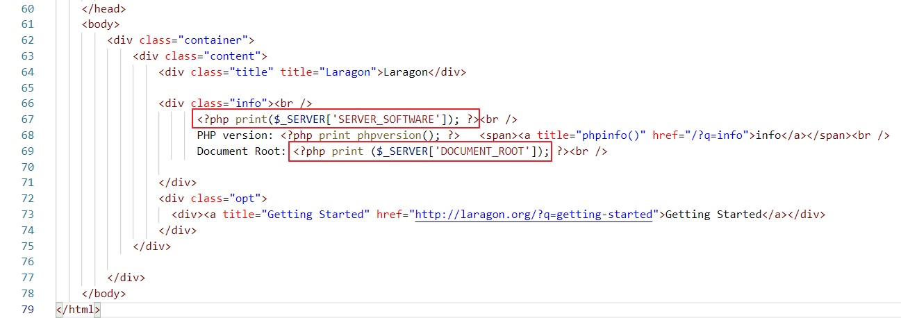Тут опять есть вставки php кода, но более локальные. Например <?php print($_SERVER['SERVER_SOFTWARE']); ?> заменяется на nginx/1.14.0