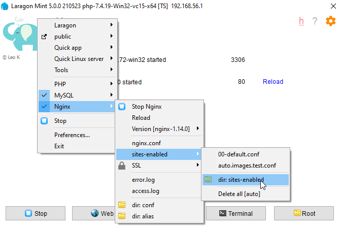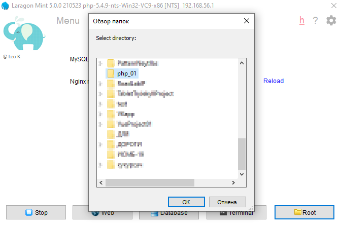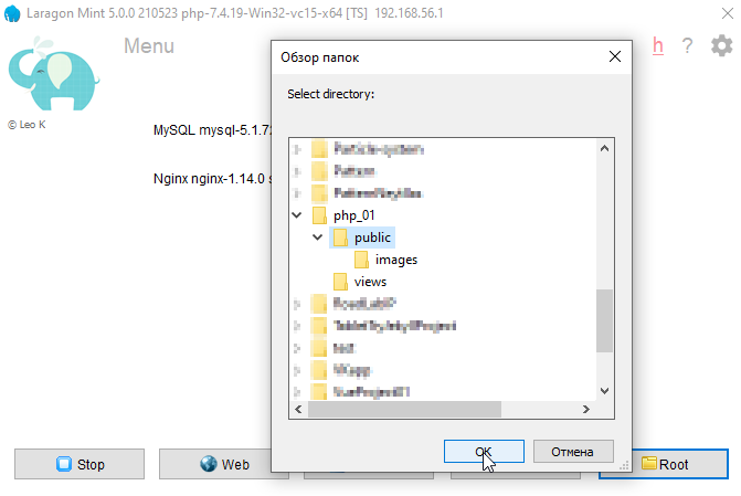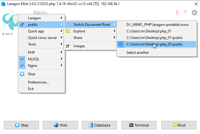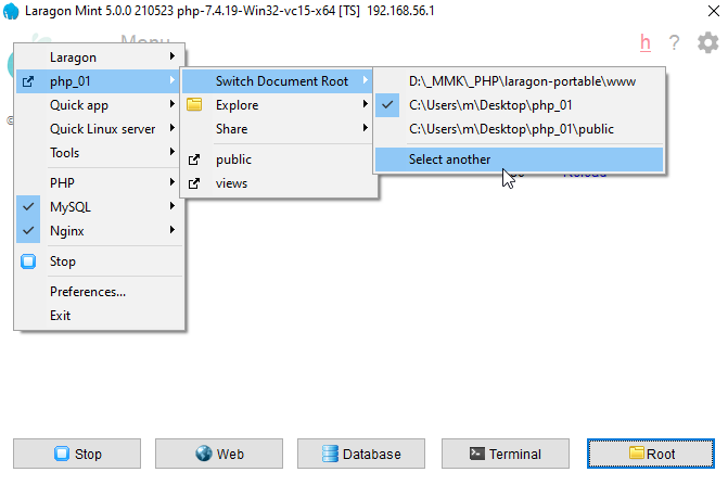 так, теперь настроим чтобы laragon раздавал эту папку. Для этого тыкаем правой кнопкой мыши в окне laragon и выбираем Select another