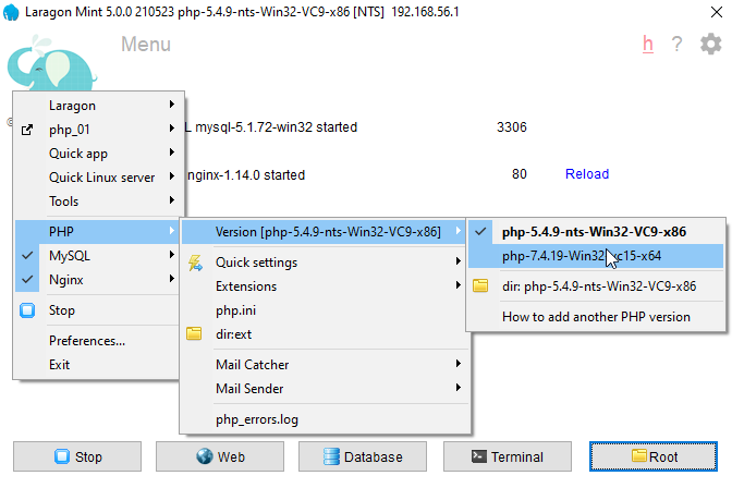 Давайте теперь еще переключим версию PHP, не зря ж мы ее качали. Снова тыкаем правой кнопкой в окне laragon