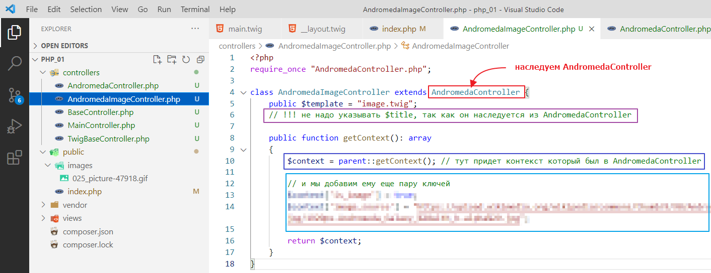 Ну то есть в рамках twig у нас уже есть двухуровневая иерархия. Теперь такую же иерархию мы делаем на уровне контроллера, то есть создаем контроллер, который наследует уже не TwigBaseController, а AndromedaController. Оот так: