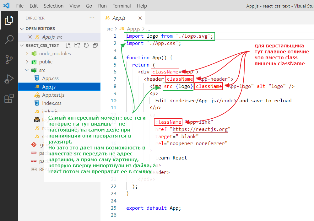 Глянем что тут происходит. Самый главный файл это App.js, он представляет собой смесь javascript и html. Такой формат именуется JSX (java script extended). Это, по сути, главный шаблон приложения
