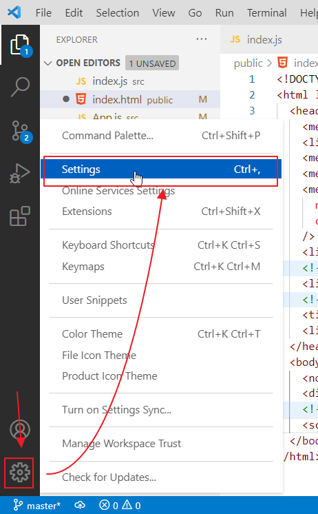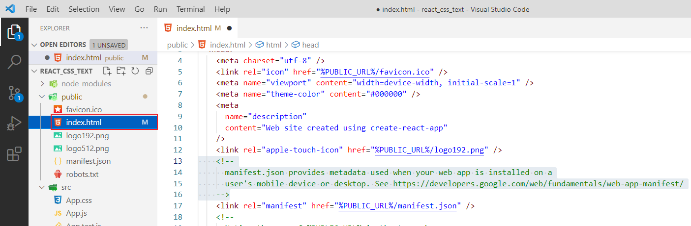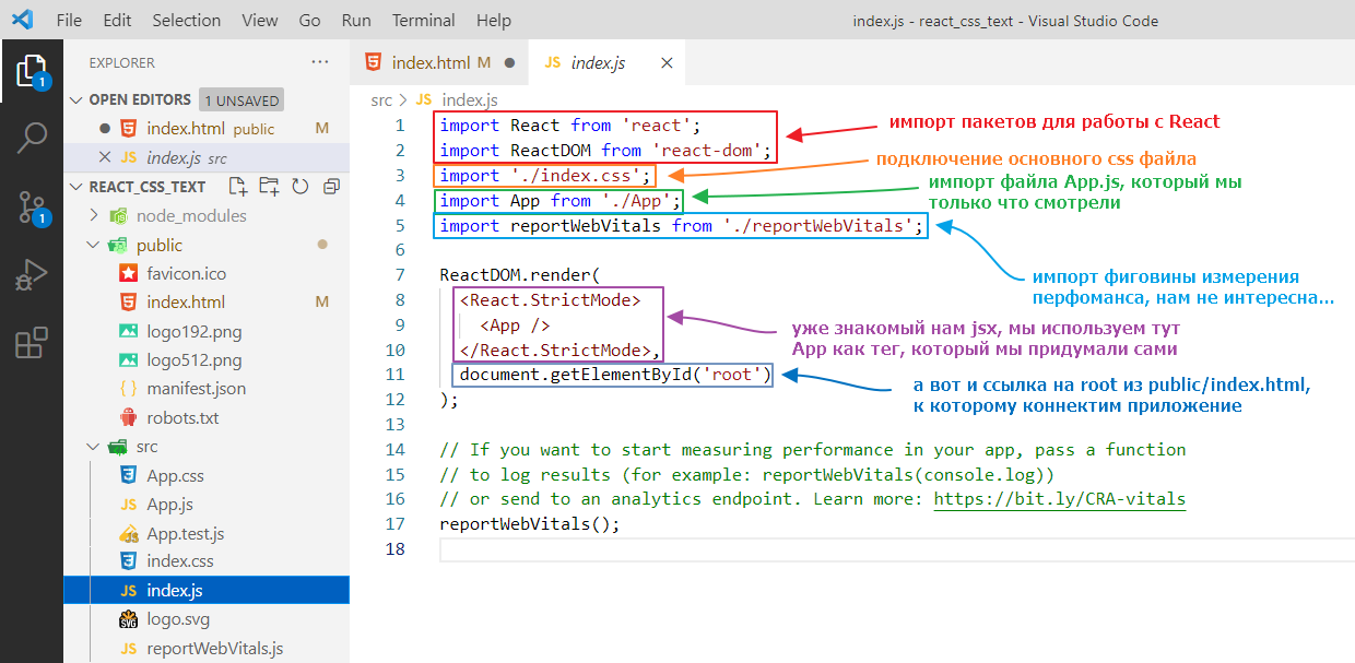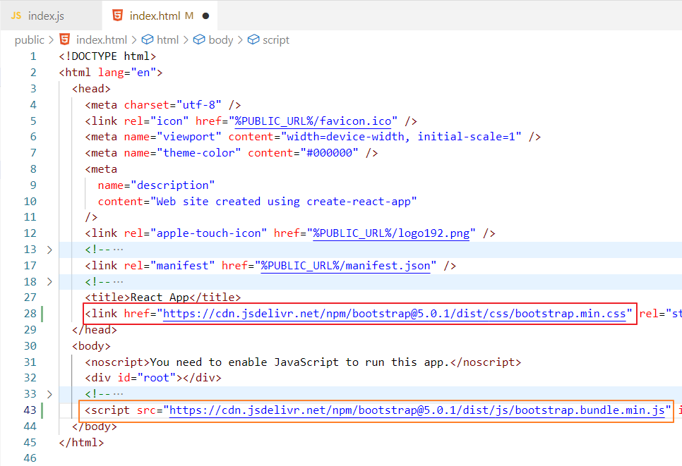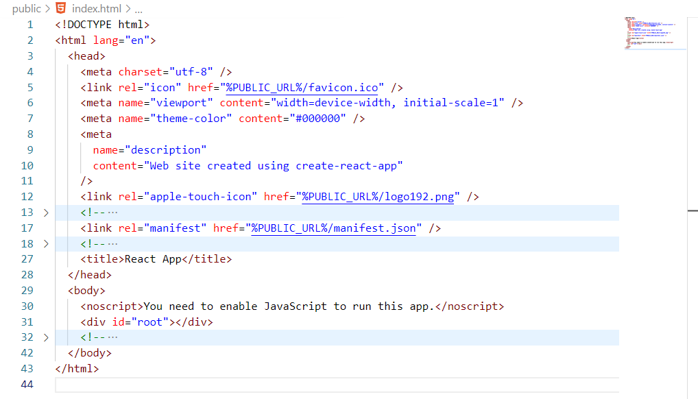 Внутри body нас интересует <div id="root"></div> это тег к которому будет привязываться react приложение. То есть именно в него будут добавляться все теги которые прописаны в App.js