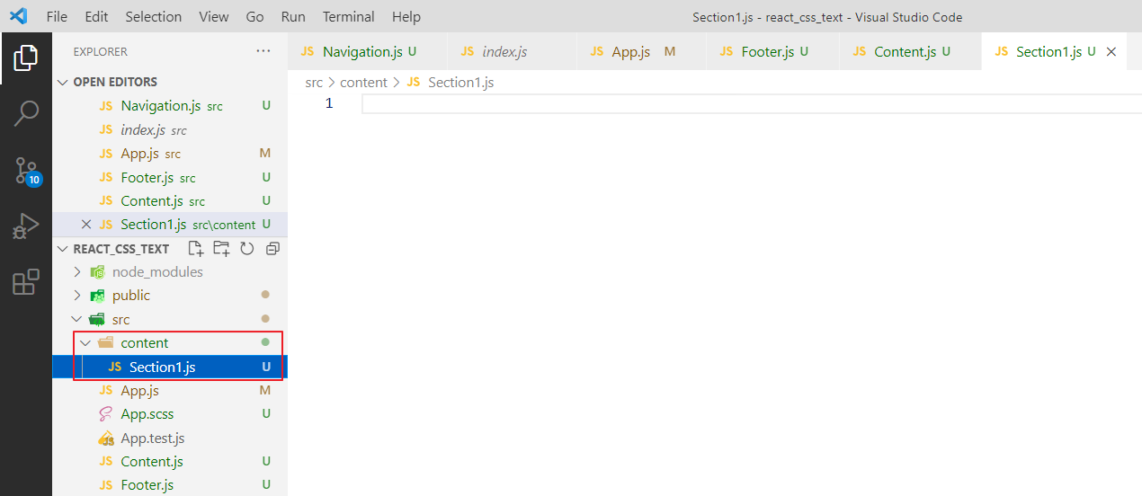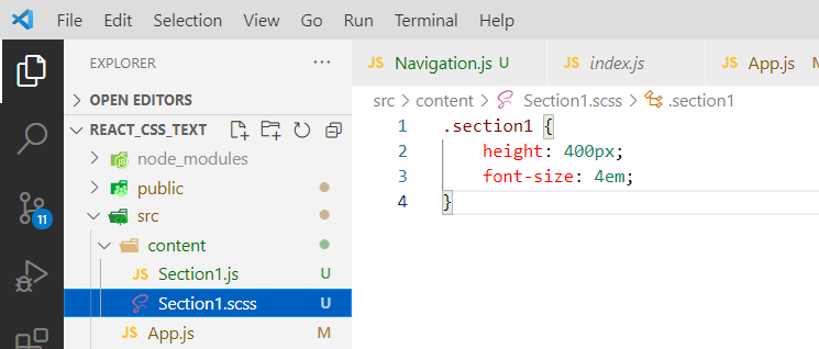 если мы, например, хотим стилизовать секцию, мы можем конечно писать все в App.scss, но более грамотно создать отдельный файлик под Section1 и прописать стили туда: