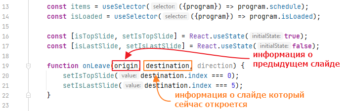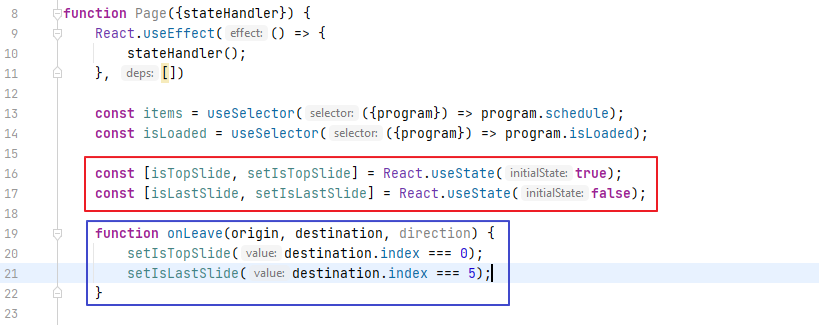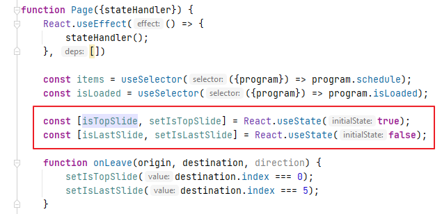 То есть когда у нас будет открыт титульный слайд, то в destination.index окажется 0, и стало быть вызовется функция setIsTopSlide с параметром true (ведь 0 == 0), и значит в переменной isTopSlide окажется true.