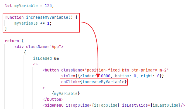 В общем добавляем функцию. Примерно, как мы уже делали на чистом js, только привязку делаем не через onclick а через onClick и фигурные скобки