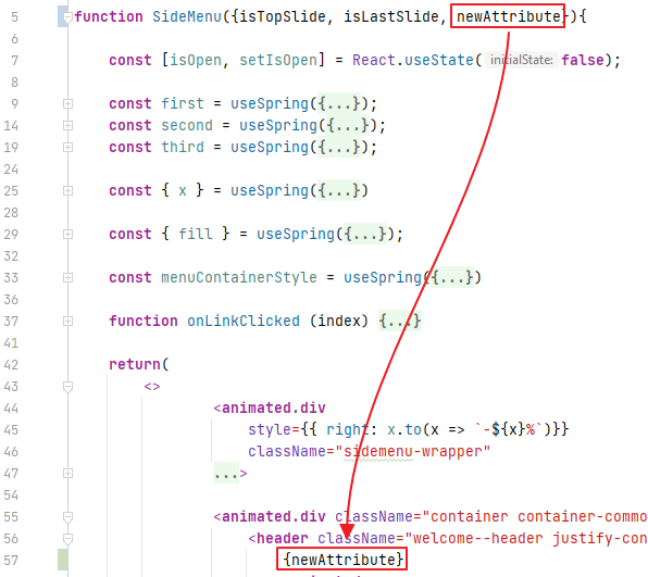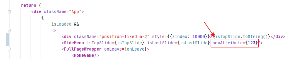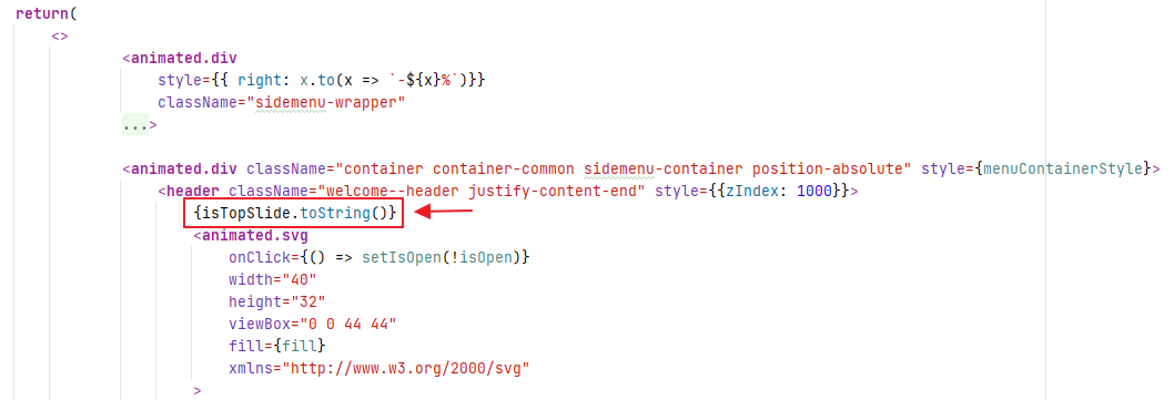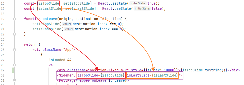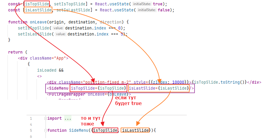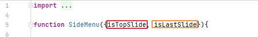 зачем оно так пишется? Идея в том что когда мы пишем в фигурных скобках {isTopSlide, isLastSlide}, мы по сути создаем для тега SideMenu два атрибута в которые можно передать значения. Собственно, значения которые мы прописываем в теге пойдут в эти переменные