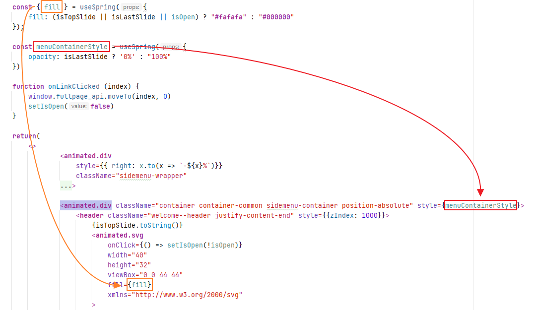 Для этого используется еще одна библиотечка react-spring. Точнее можно и без нее, но она добавляет эффект постепенного изменения значения. С помощью нее я создаю два динамических стиля